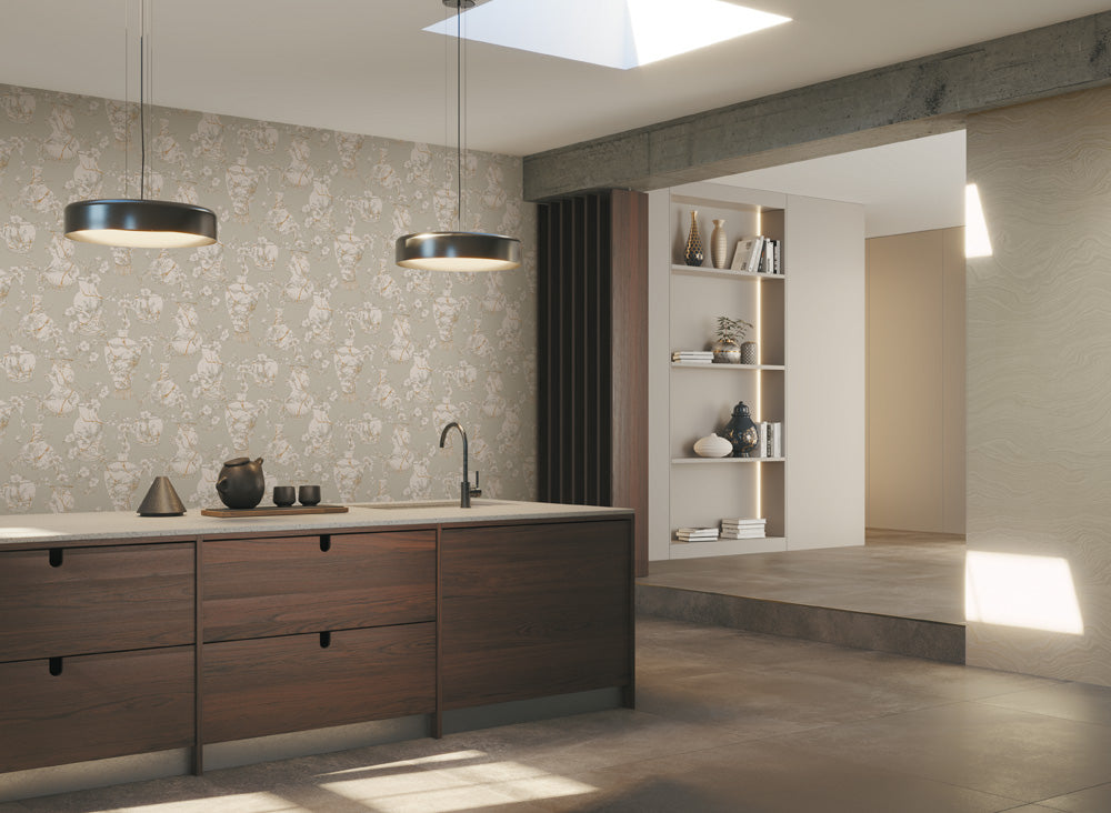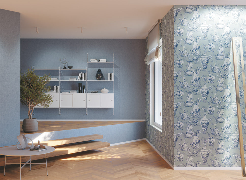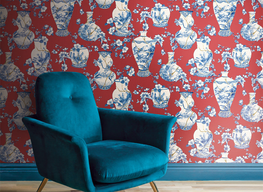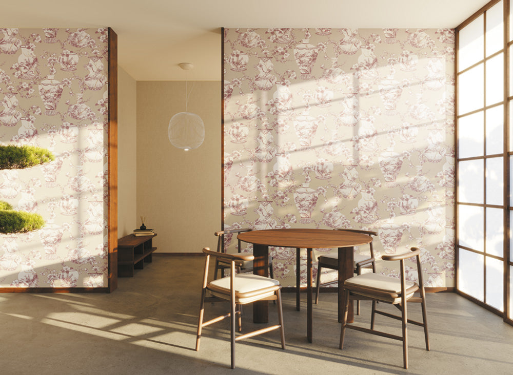 La carta da parati Kintsugi Pot di JV Italian si ispira alle stampe asiatiche. Il suo nome si riferisce a un metodo giapponese per riparare porcellane o ceramiche rotte usando lacca e polvere d'oro. Il suo motivo evoca un vaso decorato con fiori delicati in stile tradizionale.