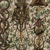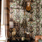 Animali maestosi abbondano in questa audace carta da parati dal design in cui bellissimi cervi e atletici cani di montagna sono legati insieme da un arazzo di quercia antica e contorta. A conferire un tocco brillante a THE GANGHOFER HUNT ci sono corni di ottone lucenti e faretre piene di frecce con la punta di piume drappeggiate con nastri rossi svolazzanti.