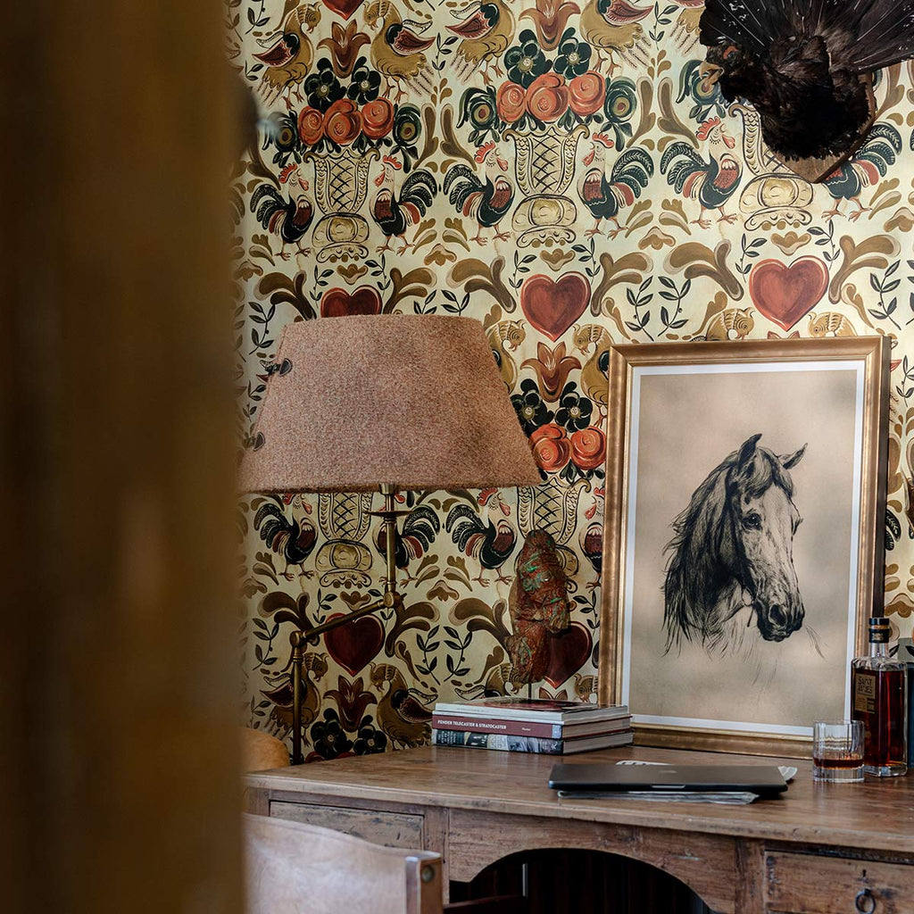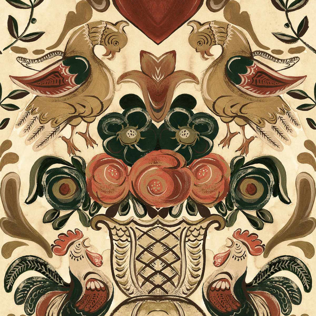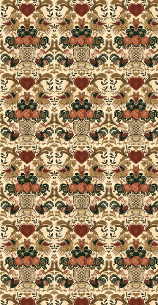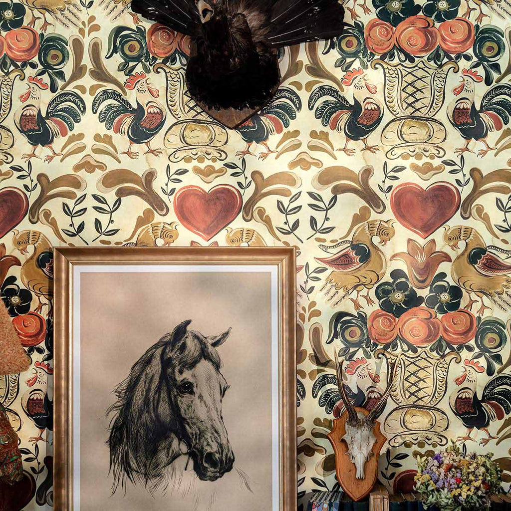 Bluso e bellissimo, questo esuberante design folk unisce un'immaginaria gallina dorata con un vibrante galletto che canta, entrambi rendono omaggio a una magnifica urna piena di fiori impressionanti. Ispirato ai racconti tradizionali tirolesi, questo disegno è una celebrazione di un popolare simbolo popolare raffigurato in sfumature dorate che domina la carta da parati GOLDEN HENNE, mentre i cuori rosso rubino sono un romantico tocco finale.