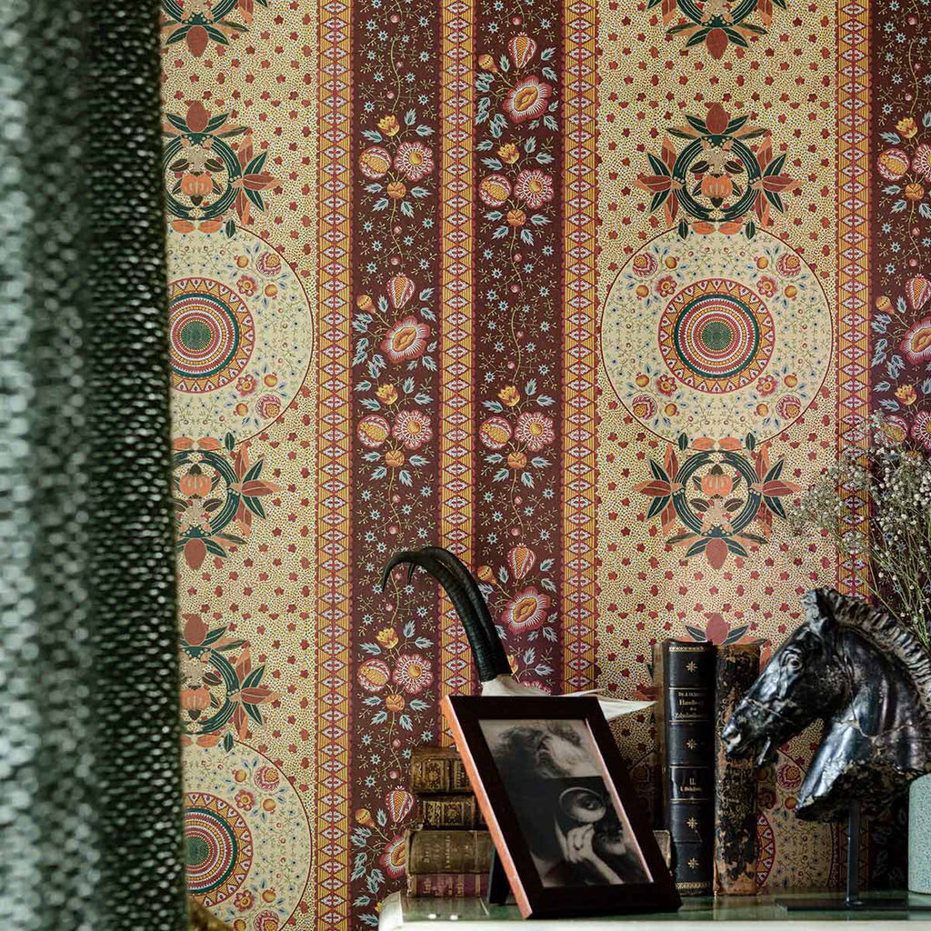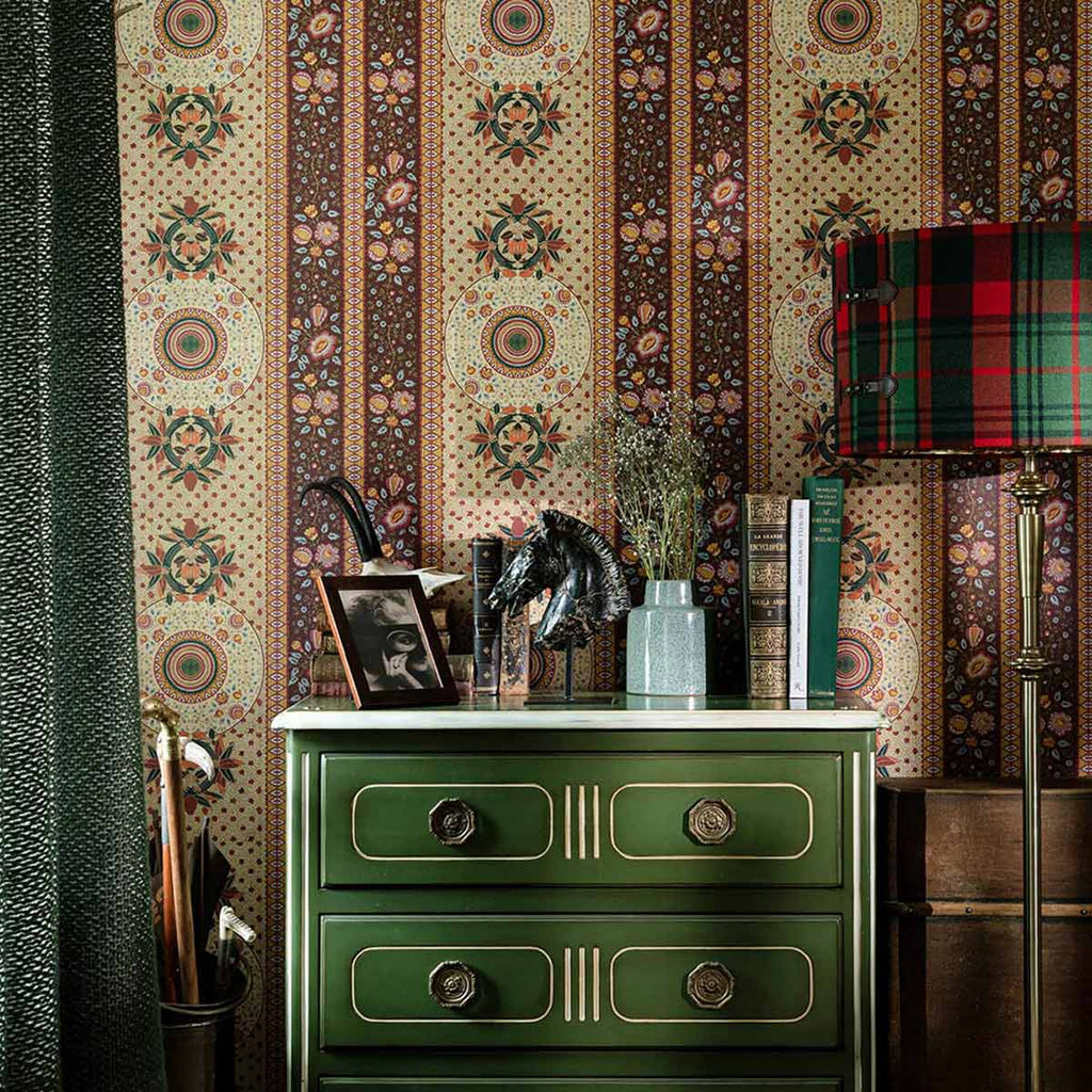 Chiamata ERBSTÜCK, che significa "cimelio di famiglia", questa carta da parati a strisce è davvero degna di tale status. Caratterizzato da un'intricata combinazione di graziosi fiori, motivi simili a punti e foglie delicate disposte in motivi circolari, è un design senza tempo che racchiude l'essenza del Tirolo.
